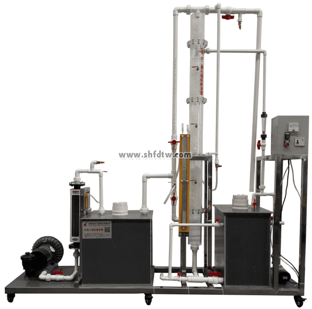 有機玻璃三段填料塔、液體緩沖箱、氣體緩沖箱、進出口風管、渦輪氣泵、噴淋系統(tǒng)、加液泵、氣體流量計、液體流量計、SO2氣體鋼瓶、減壓器、SO2氣體流量計、電控箱、管道閥門、不銹鋼支架。