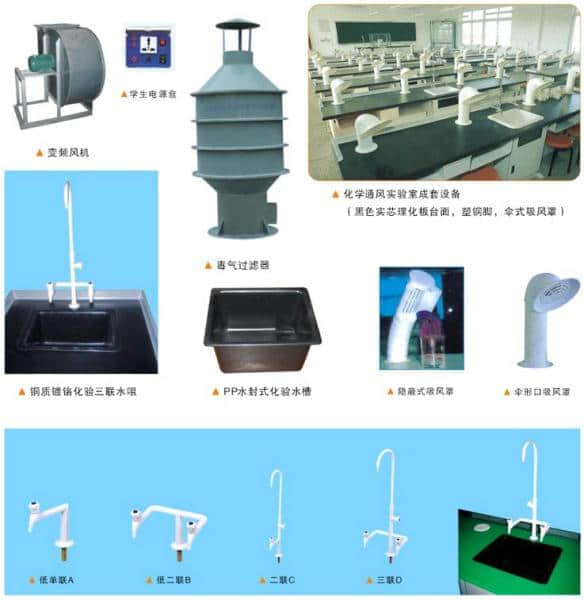 本設備針對化學實驗過程中會產(chǎn)生不同程度的有害氣體,且瞬間濃度高的現(xiàn)象,采用桌面通風系統(tǒng)及時排出有害氣體;通風管道的風機設置充分考慮降噪要求,噪音處理到符合國家標準允許范圍;采用無極調(diào)速技術(shù)對風機進行調(diào)速,使風量、風速可調(diào);并采用水池、臺面一體化結(jié)構(gòu),即增加了學生實驗空間,又增加了防潮、防腐能力。設備整體設計科學,將電器、通風、給排水、實驗臺有機地結(jié)合在一起,即方便教師演示又方便學生實驗操作,教師可根據(jù)教學需要控制輸送學生用交直流電源和220V交流電源,具有過載保護、短路保護和漏電保護功能,確保實驗安全。