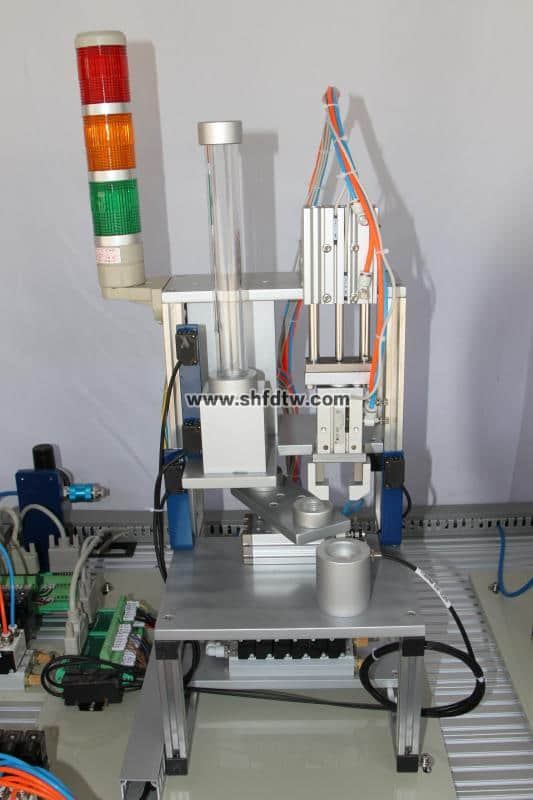 主要由井式供料單元、三工位旋轉工作臺、平面軸承、沖壓裝配單元、光電傳感器、磁性開關、電磁閥、交流伺服電機及驅動器、支架、機械零部件構成 |