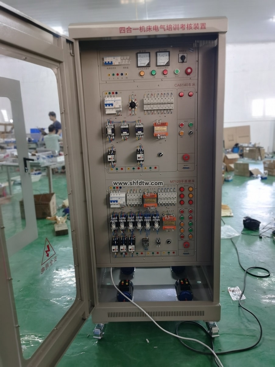 1、本裝置采用標(biāo)準(zhǔn)配電柜為主體柜,充分利用該柜雙面空間位置,每一面分別設(shè)有機(jī)床電氣線路;