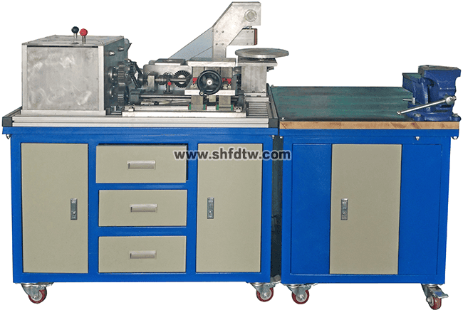 6.間歇回轉(zhuǎn)工作臺:主要由四槽槽輪機(jī)構(gòu)、蝸輪蝸桿、推力球軸承、角接觸軸承、臺面、支架等組成。由多級變速箱經(jīng)鏈傳動、齒輪傳動、蝸輪蝸桿傳動及四槽槽輪機(jī)構(gòu)分度后,實(shí)現(xiàn)間歇回轉(zhuǎn)功能;能完成蝸輪蝸桿、四槽槽輪、軸承等的裝配與調(diào)整實(shí)訓(xùn)。