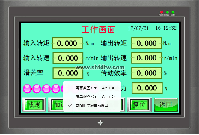 4、帶傳動(dòng)實(shí)驗(yàn)臺(tái)與觸摸屏顯示面板為集成一體(顯示面板非獨(dú)立裝置),觸摸屏顯示面板上有顯示轉(zhuǎn)矩、轉(zhuǎn)速、張緊力、加載、主電機(jī)輸入電壓電流,從電機(jī)輸入電壓電流等項(xiàng)目;并且通過觸摸屏的上加速和減速按扭可以控制電機(jī)轉(zhuǎn)速的變化。