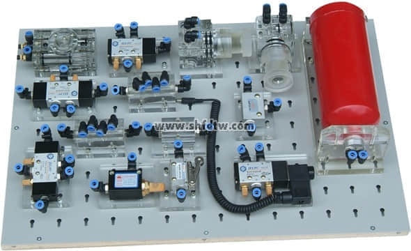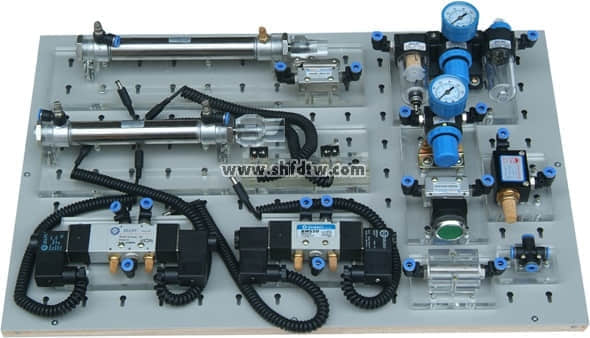 2、配備工業(yè)用常用氣動元件,且均配有過渡底板,可方便、隨意地將元件安放在實驗面板(面板帶“T”溝槽形式的鋁合金型材結構)上。回路搭接采用快換接頭,拆接方便快捷。