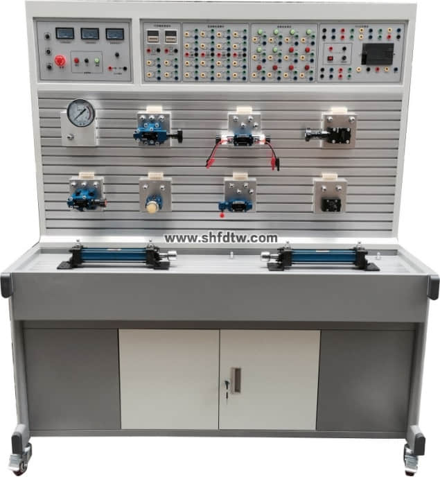 液壓與氣壓傳動PLC控制綜合實訓(xùn)裝置采用“二合一”結(jié)構(gòu),配備兩套實驗設(shè)備,一套為氣動與PLC實訓(xùn)平臺,另一套為液壓傳動與PLC實訓(xùn)平臺,且各自配有獨立的PLC電氣控制設(shè)備。