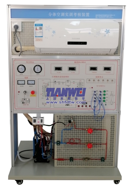 2、裝置直觀展示了空調(diào)的系統(tǒng)結(jié)構(gòu)和工作原理,便于教學(xué)演示講解及學(xué)生對(duì)課本知識(shí)的理解掌握。配置的交流電壓表、交流電流表、溫度表、真空壓力表以及相應(yīng)的信號(hào)指示燈,使整個(gè)空調(diào)系統(tǒng)的實(shí)時(shí)工作狀態(tài)一目了然;前面板中間印有電氣控制系統(tǒng)原理圖,并設(shè)有相應(yīng)測(cè)試點(diǎn)。