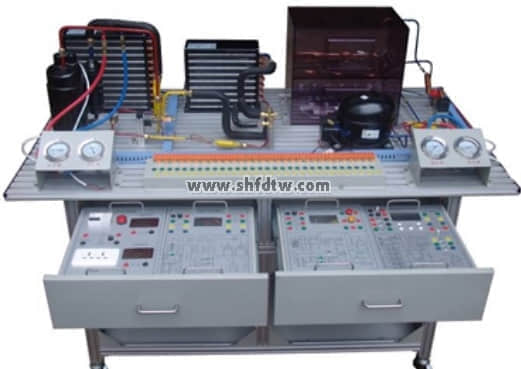 2、導軌式鋁合金安裝平臺由標準規(guī)格的鋁合金工業(yè)型材組成,作為學生操作訓練的平臺,上面安裝有空調(diào)系統(tǒng)部件和冰箱系統(tǒng)部件。