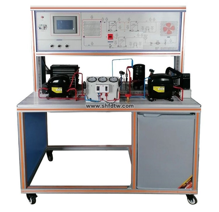 2、控制面板:面板上印刷有制冷系統(tǒng)原理圖,結(jié)合系統(tǒng)中實(shí)際制冷器件,可很好的理解各個(gè)系統(tǒng)器件在制冷系統(tǒng)中的作用。彩色形式代表制冷劑各種工況狀態(tài)。