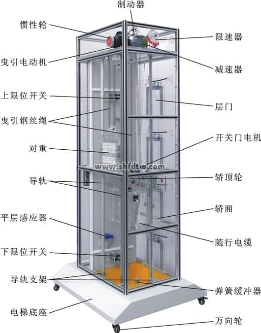 電梯是根據(jù)常見的升降式電梯結(jié)構(gòu),采用透明有機(jī)材料制成,其結(jié)構(gòu)與實(shí)際電梯完全相同,且?guī)缀蹙邆淞藢?shí)際電梯的所有功能。事實(shí)上可以把它看作是小型化了的真實(shí)電梯。為了便于教學(xué),電梯大部分部件均是采用透明有機(jī)材料制成,使得電梯的內(nèi)部結(jié)構(gòu)一目了然;同時(shí),電梯的運(yùn)行過程,以及每個(gè)動(dòng)作都十分明了,且可以反復(fù)實(shí)際動(dòng)手操作。使學(xué)生能夠很直觀、透徹地了解、掌握電梯的結(jié)構(gòu)及其動(dòng)作原理,達(dá)到事半功倍的效果。解決了以往電梯教學(xué)中單純的理論教學(xué)方式或是參觀實(shí)際電梯時(shí)所帶來的不安全,無法全面了解其內(nèi)部結(jié)構(gòu)及運(yùn)行過程等種種實(shí)際問題。