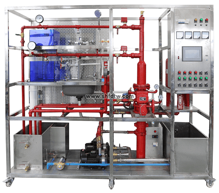 2、消防給水系統(tǒng):主要有給水箱、噴淋泵、穩(wěn)壓罐、濕式報(bào)警閥、壓力開關(guān)、水流指示器、消防給水管道、閉式噴淋頭等組成。管路采用鍍鋅管進(jìn)行設(shè)計(jì),可進(jìn)行鍍鋅管的切割、套絲、安裝和通水試驗(yàn)操作,通過控制系統(tǒng)可實(shí)現(xiàn)噴淋滅火功能。