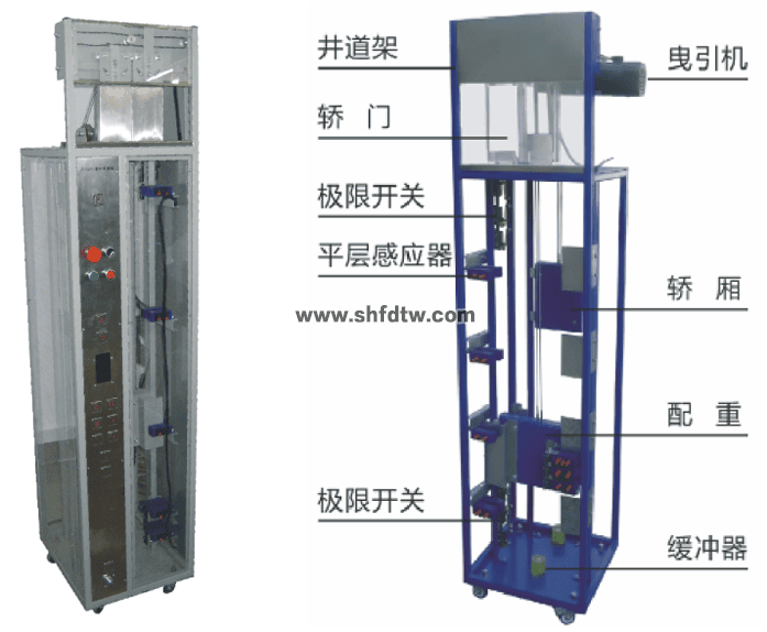 1、模型電梯設(shè)4層4站,由模擬井道架、轎廂、對(duì)重、曳引機(jī)、電梯門、門電機(jī)、各層站外呼盒及主要安全裝置組成,固定設(shè)置在實(shí)驗(yàn)臺(tái)側(cè)面。模擬井道架內(nèi)需配置用于檢測轎廂位置的樓層感應(yīng)器、平層感應(yīng)器(與實(shí)際電梯相似)等,其接線端子引至模擬井道架的插接孔上。井道架采用金屬材料為主體支架,有機(jī)玻璃封閉?!镌O(shè)備必須采用臺(tái)式結(jié)構(gòu),設(shè)置活動(dòng)式抽屜電氣板,每層抽屜板均設(shè)置有公共接線板(總線型接線方式,總線連接點(diǎn)數(shù)必須達(dá)到120點(diǎn)以上),抽屜電氣板之間采用工業(yè)坦克鏈連接,公共抽屜板連線采用真實(shí)電梯多芯隨行電纜。